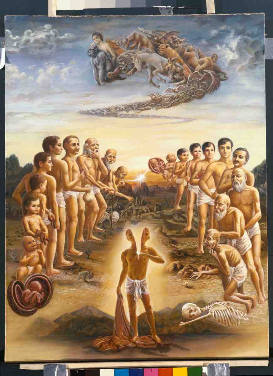Because the mind is ultimately controlled by the Supreme Personality of Godhead, Krishna, the word apasmrtih is significant. Forgetfulness of one's own identity is called apasmrtih. This apasmrtih can be controlled by the Supreme Lord, for the Lord says, mattah smrtir jnanam apohanam ca: [Bg. 15.15] "From Me come remembrance, knowledge and forgetfulness." Instead of allowing one to forget one's real position, Krishna can revive one's original identity at the time of one's death, even though the mind may be flickering. Although the mind may work imperfectly at the time of death, Krishna gives a devotee shelter at His lotus feet. Therefore when a devotee gives up his body, the mind does not take him to another material body (tyaktva deham punar janma naiti mam eti [Bg. 4.9]); rather, Krishna takes the devotee to that place where He is engaged in His pastimes (mam eti), as we have already discussed in previous verses. One's consciousness, therefore, must always be absorbed in Krishna, and then one's life will be successful. Otherwise the mind will carry the soul to another material body. The soul will be placed in the semen of a father and discharged into the womb of a mother. The semen and ovum create a particular type of body according to the form of the father and mother, and when the body is mature, the soul emerges in that body and begins a new life. This is the process of transmigration of the soul from one body to another (tatha dehantara-praptih [Bg. 2.13]). Unfortunately, those who are less intelligent think that when the body disappears, everything is finished. The entire world is being misled by such fools and rascals. But as stated in Bhagavad-gita (2.20), na hanyate hanyamane sarire. The soul does not die when the body is destroyed. Rather, the soul takes on another body.